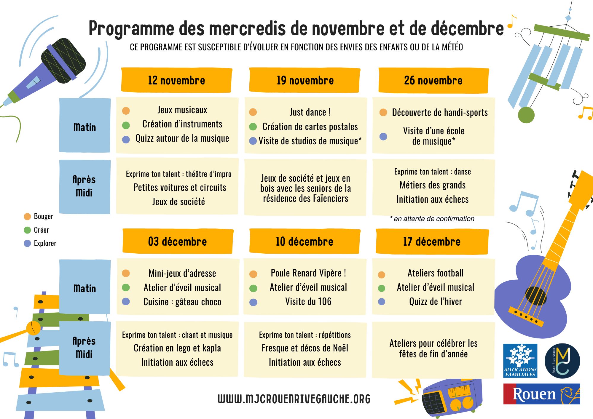 Plannings de l'accueil de loisirs des mercredis de novembre et décembre
